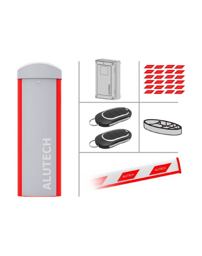 Комплект шлагбаума ALUTECH BV-5 (со стрелой 5,3 метра). Состав: Тумба шлагбаума BV-5; Блок управления со встроенным радиоприемником; 2 ПДУ (AT-4N); Заглушка для прямоугольной стрелы; Рейка прямоугольная RBN8-5; Демпфер BVD; Наклейки светоотражающие. Напряжение питания 230В; напряжение питания двигателя 24В; тип редуктора электромеханический.